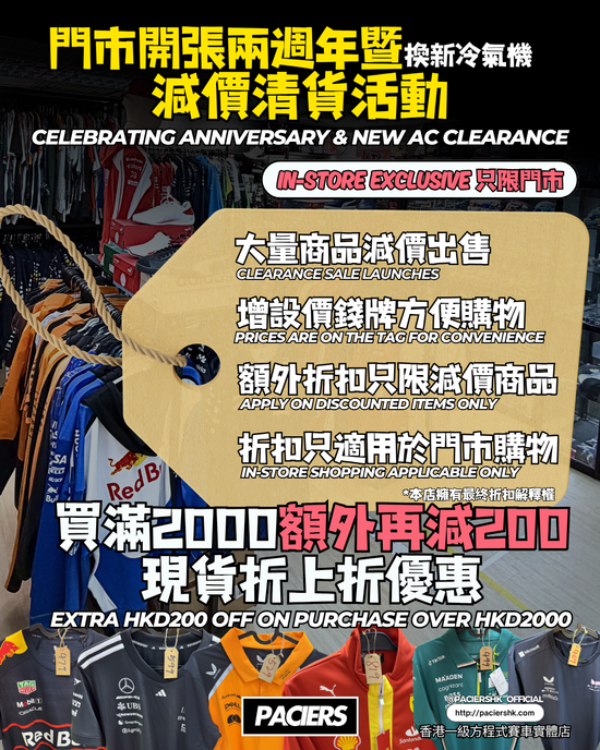 為慶祝PACIERS實體店開張兩週年,以及業主終於換上性能十足既冷氣機;店內大量商品會減價出售,另外再有「買滿HKD2000額外再減HKD200」既「折上折」優惠。