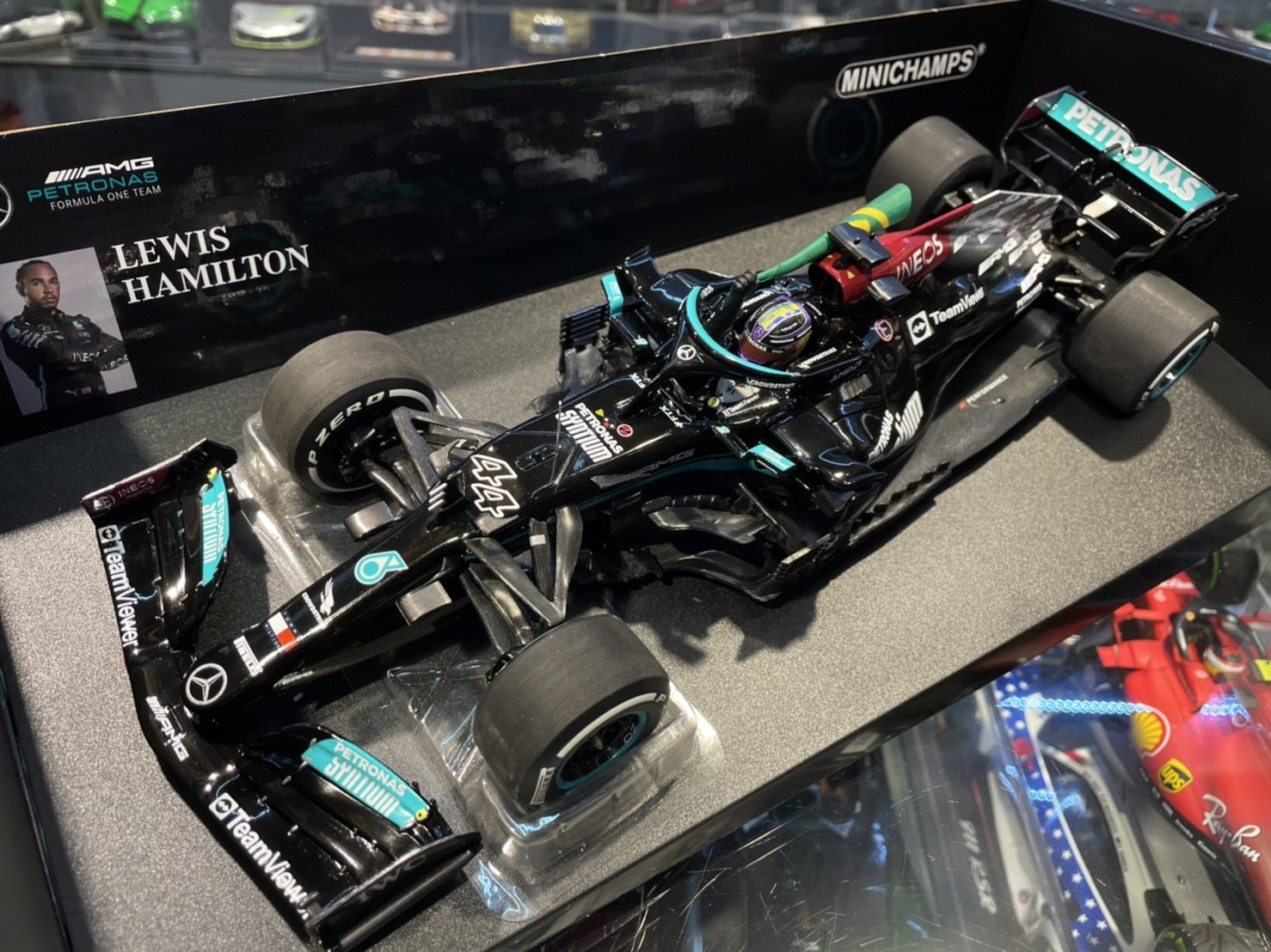 [PRE-ORDER] Minichamps 1:18 F1 (2021) Mercedes-AMG W12 Lewis Hamilton Brazilian Grand Prix with Flag